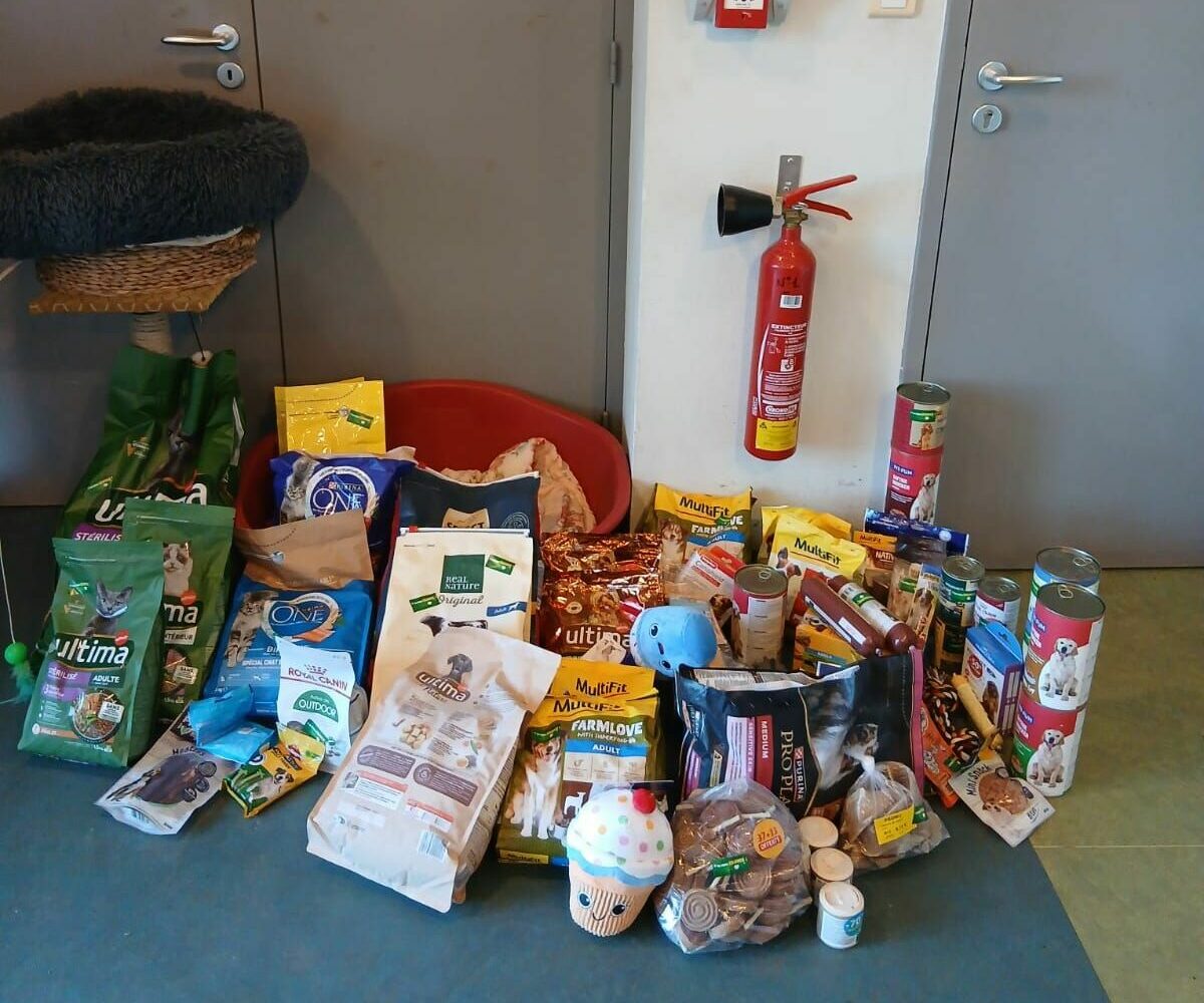 Aurélie de La forêt encrée est venue au refuge avec une véritable montagne de dons collectés auprès de ses clients pour nos pensionnaires.
